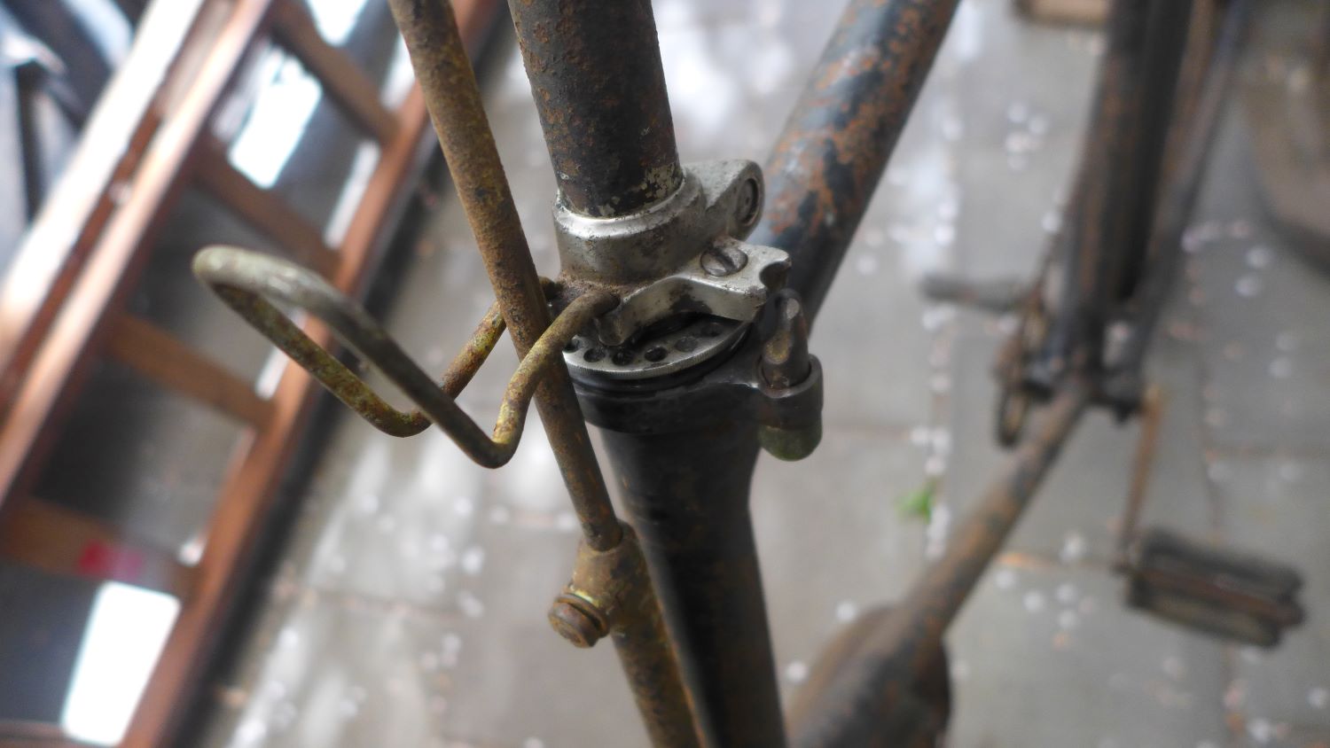 Er in een oude wrakkige Singer herenfiets. Leuke framemaat van 26 inch (66cm) en ondanks de slechte staat wel een aantrekkelijke fiets. De bouwwijze van lagers en tandwielen is voornamelijk nog zo als een safety is gemaakt maar de framevorm en wielmaat is al behoorlijk zoals de 20e eeuwse roadsters . Wel zijn de buizen naar het achterwiel veel dikker dan wat we kennen en ook de zadellug is safety achtig De zadelbuis heeft twee uiteinden , een T model.