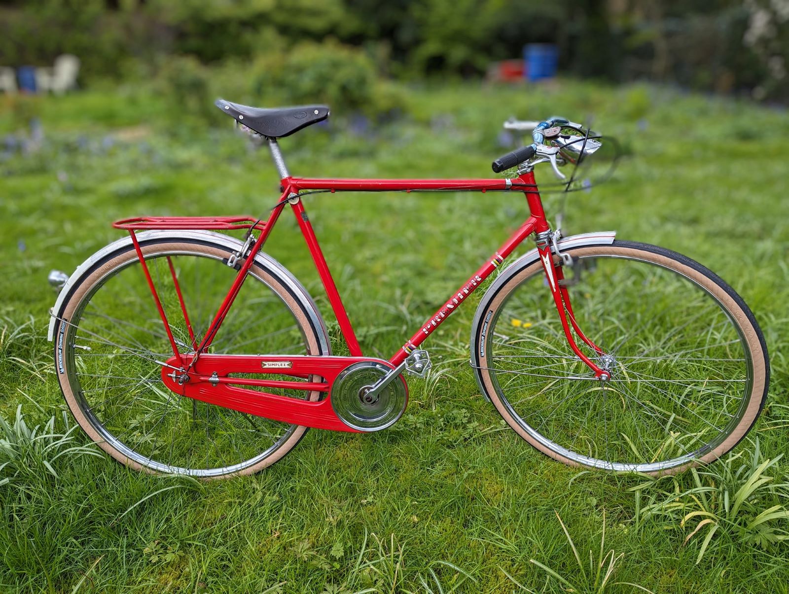 Voor een rechtgeaarde republikein is er geen betere klusdag dan koningsdag. Ik ben de hele dag in de weer geweest met mijn rode Simplex, opgetrokken uit 531 Reynolds, van het jaar 1957. Veel smeer- en poetswerk. Het is een rare fiets, in de kleur rood heb ik hem nog nooit eerder gezien. Technisch is het geheel inmiddels in goede staat, remt uitstekend, banden nieuw en ja, die 4 sp SA doet gewoon zijn werk uitstekend. Allerlei andere spulletjes erop gezet: zadel van Ideale en een Titan stuur. Michelinbandjes en NOS Lyotard pedalen, het geheel is wat meer mediterraan geworden. Simplex klinkt voor mij ook wat Frans, ook al komt het uit Mokum. Kortom, blij met mijn rode fiets die ik vorig jaar in de staat ouwelullentrappert kocht.